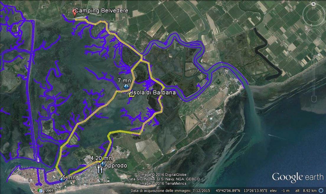 Con questa escursione andiamo alla scoperta della Laguna di Levante e di Grado interna. Partendo dal Camping Belvedere puntiamo ad E seguendo il canale e tenendo l’Isola del Lovo alla nostra destra. Ancora 1 NM fino al bivio dove puntiamo verso SSE pagaiando per circa 0,60 NM fino al prossimo bivio. Qui imbocchiamo il canale alla nostra destra in direzione SW (Valle Cavarera alla nostra SX) per circa 1,5 NM, poi a S (Valle Goppion alla nostra sx), dopo 0,5 NM volendo abbiamo il Ristorante L’Approdo, continuando passiamo il cimitero puntando l’Isola della Schiusa che circumnavigheremo dalla parte E. A questo punto altri 2 NM direzione NE, lungo il canale (Litoranea Veneta), fino all’Isola di Barbana dove possiamo fare una sosta. Da qui altri 2 NM e siamo al punto di partenza. |